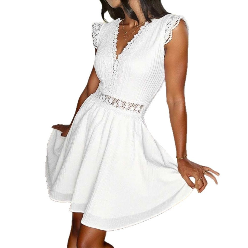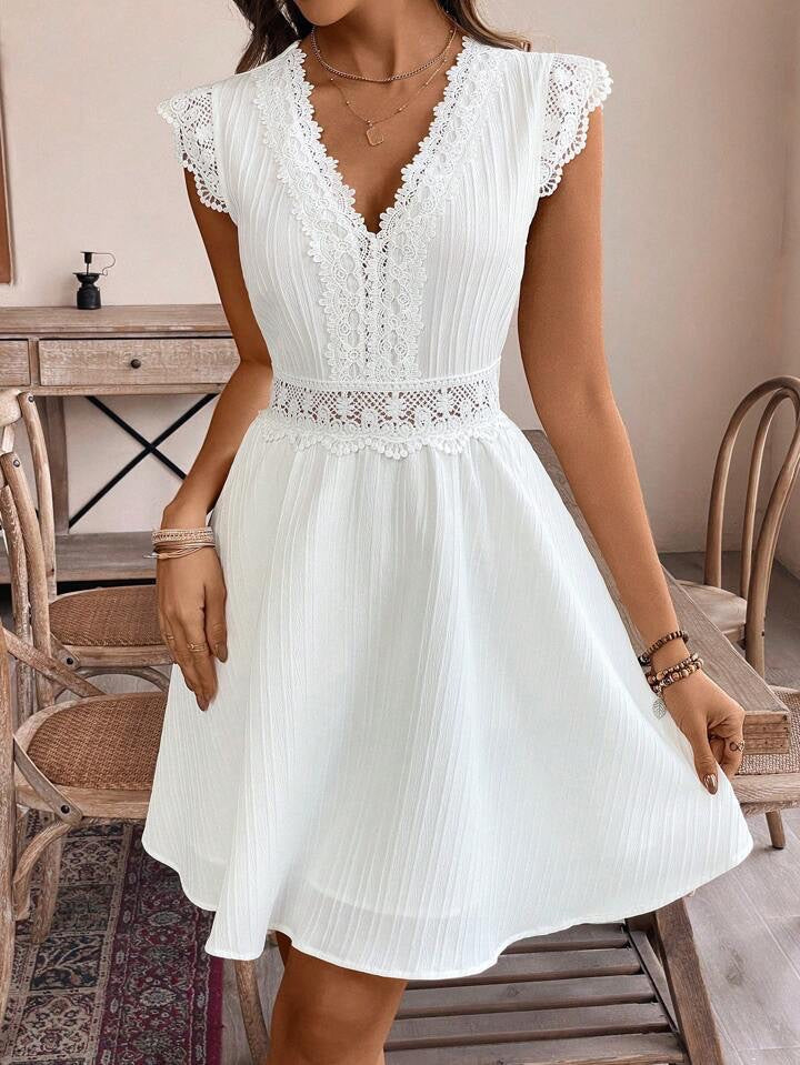 Hollow Out V-neck Waist Trimming Short-sleeved Leisure Dress